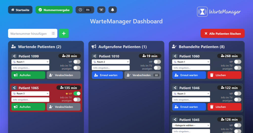 Warteliste im Browser steuern: Aufrufen, Reihenfolge ändern, Räume zuweisen, Notizen setzen.