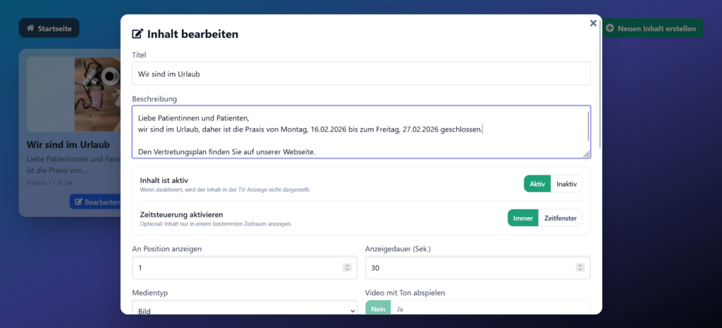 Passen Sie TV-Anzeige, Ticketseite und Hinweise mit dem integrierten Template-Designer an: Logo, Farben, Texte und Layout für Ihre Branche. Erstellen Sie eigene Inhalte für die TV-Anzeige.